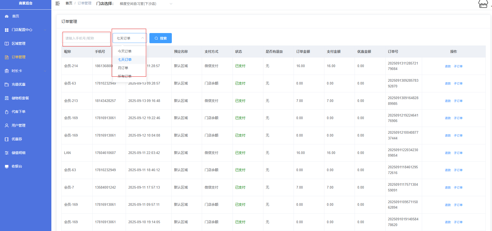 5.查看用户昵称、手机号、创建时间、预定名称、支付方式、状态、是否有退款、订单金额、优惠金额、订单号,操作(退款、子订单)