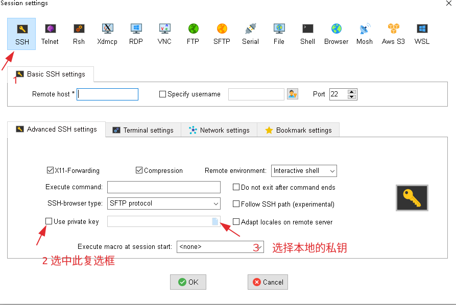 在新建session中,输入ip和登录所用的用户名之外,还需要指定公钥所对应的私钥(公钥发给对方,私钥自己使用!!)