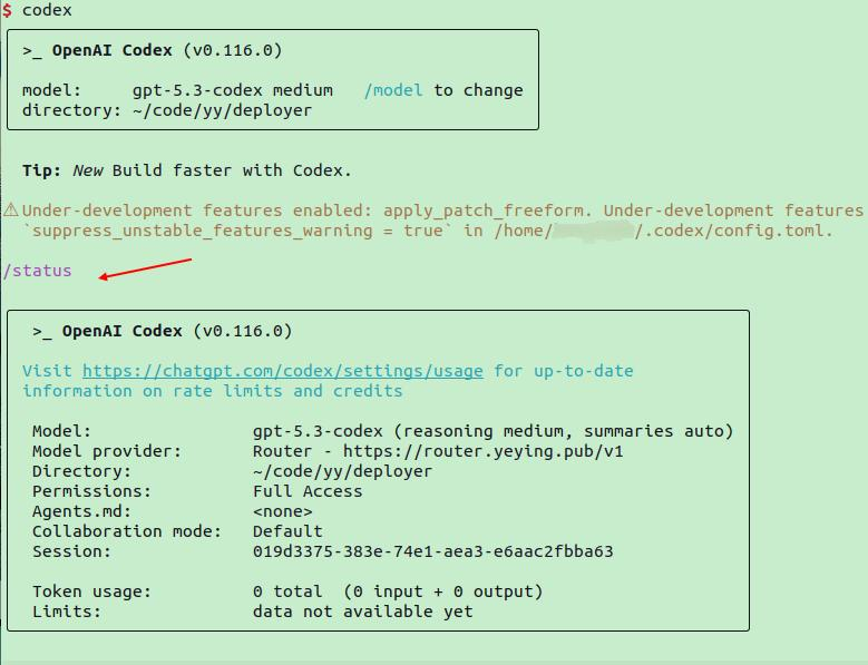 source $HOME/.zshrc或source $HOME/.bashrc使得配置生效 - 在任意目录下执行codex进行使用,使用/model 命令切换模型,使用/status命令查看状态,如下图所示