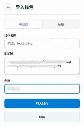 使用助记词方式进行导入时,一定要输入保存的助记词以及对应的密码,钱包名称可以根据个人喜好进行配置(默认为 导入的钱包)