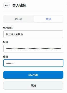 使用私钥方式进行导入时,一定要输入保存的私钥以及对应的密码,钱包名称可以根据个人喜好进行配置(默认为 导入的钱包)